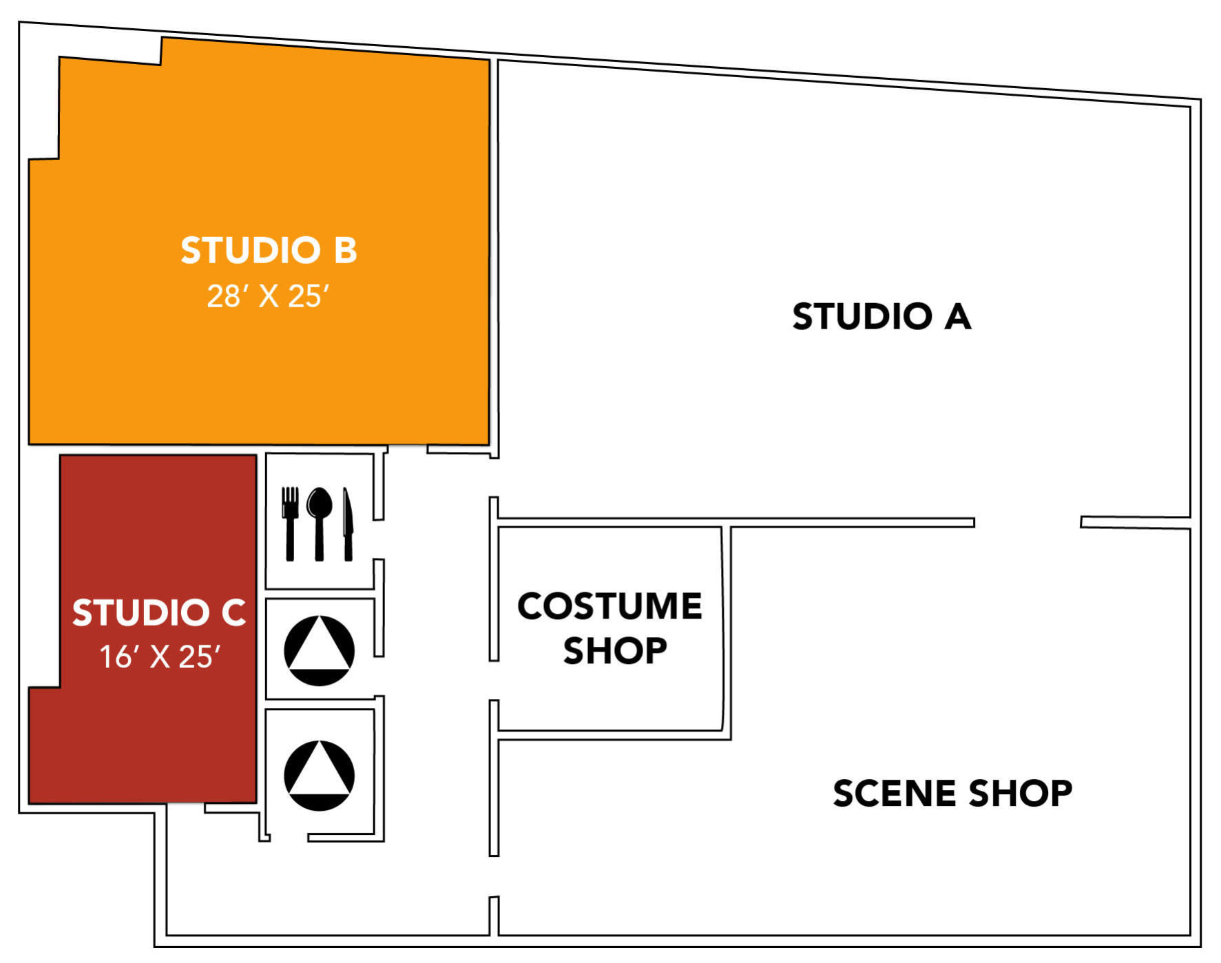 Both Studios include access to the kitchenette and spacious restrooms, as well as easy access to parking, freeway, and public transportation.