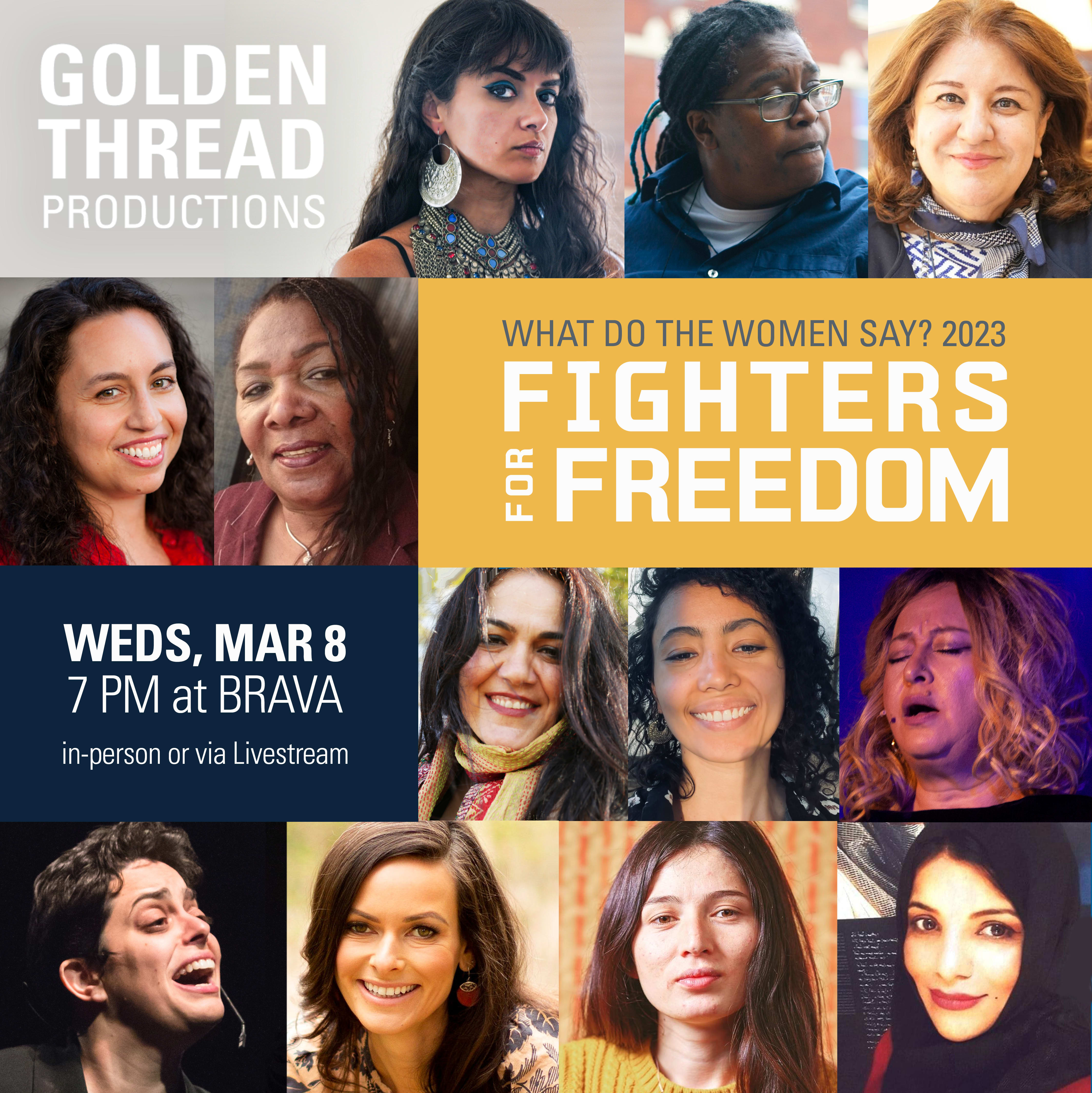 Our annual celebration of International Women’s Day WHAT DO THE WOMEN SAY? 2023: Fighters for Freedom Presented in a hybrid format with artists appearing in-person and virtually. Audiences may join in-person or online. Spotlighting the work of extraordinary Middle Eastern women artists who are fighting against injustice through their art. Marjan Vahdat, Persian vocalist; Lujain Jo, Iraqi-born, Beirut-based filmmaker, activist, performance artist; Andrea Assaf, writer, performer, director, with Lubana Al-Quntar, Syrian coloratura soprano, from Art2Action; Mahjabin Khanzada, emerging Afghan performer, directed by Polina Smith from Crescent Moon Theater Productions, accompanied by Layle Omeran, Yemeni Oud musician & singer; Her Story Is, a collective led by independent women writers and artists from the United States and Iraq, including Hanna Mohammed, Jennifer Jean, Thawra Yaqoub, Letta Neely and Elham Nasser Al-Zabaidy. Following the presentations, Executive Artistic Director Sahar Assaf will facilitate an engaging conversation between participating artists and audience. The full program is 120 minutes without intermission. March 8, 2023, 7:00 PM, Pacific Time | Brava Theater Center (2781 24th Street, San Francisco, CA 94110) and online Tickets ($20-$100) are available at goldenthread.org. No one will be turned away for lack of funds.